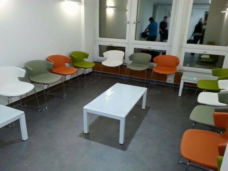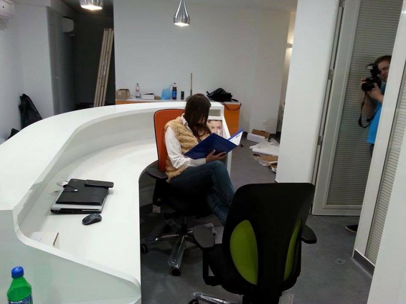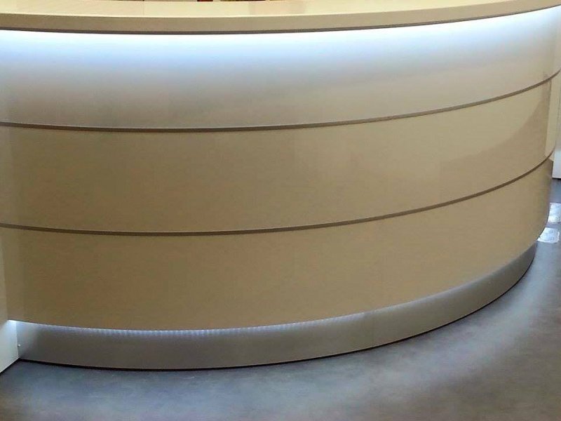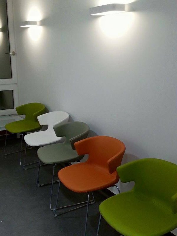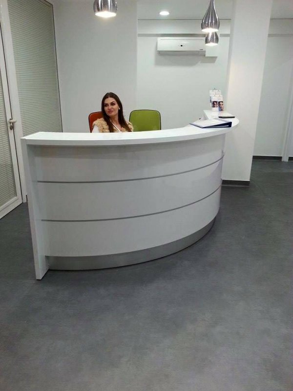Die Praxis komplett mit Empfang, Sprechzimmer und Wartezone eingerichtet. Wir lieferten eine halbrunde weiße Hochglanz Empfangstheke, welche durch unser Montage Team aufgebaut wurde, Bestuhlung des Wartebereichs und Sprechzimmereinrichtung.